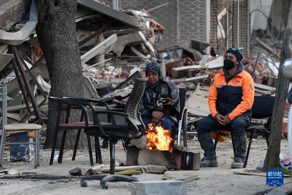 2月21日,在土耳其哈塔伊省,人們坐在震后廢墟旁。