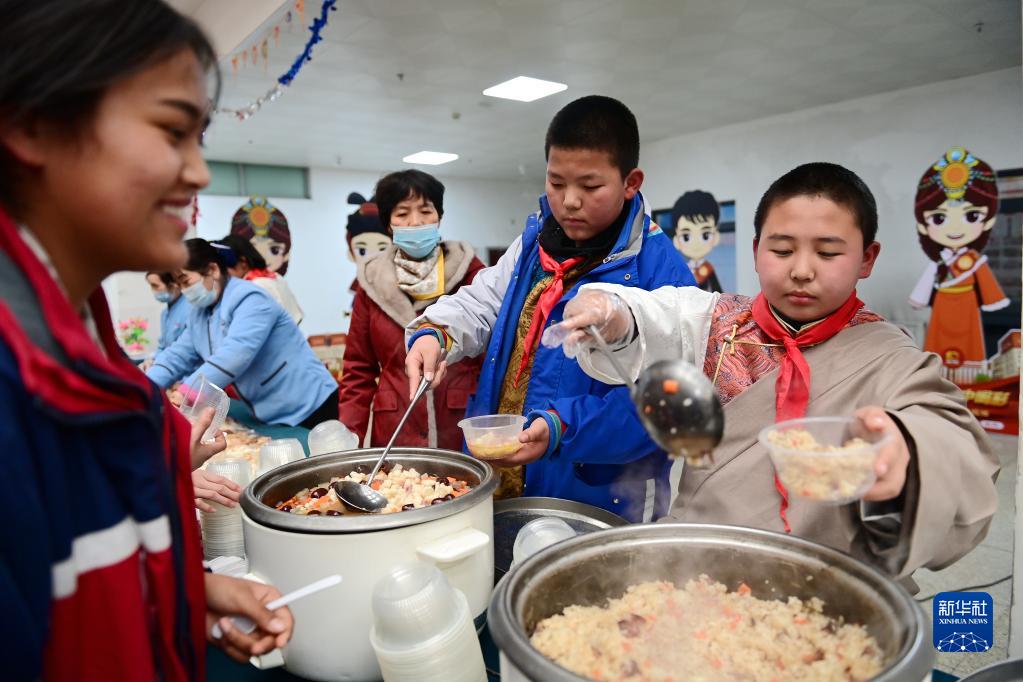 2月21日,在西安市浐灞第一中學(xué)舉行的藏歷新年團拜活動(dòng)上,學(xué)生品嘗特色小吃。