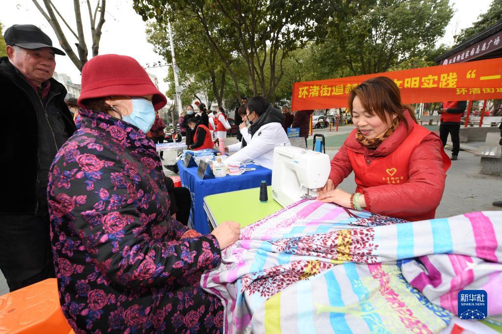 2月22日,浙江省湖州市,縫紉店主王新妹(前右)在志愿服務(wù)站為市民周月華(前左)縫制新被套。