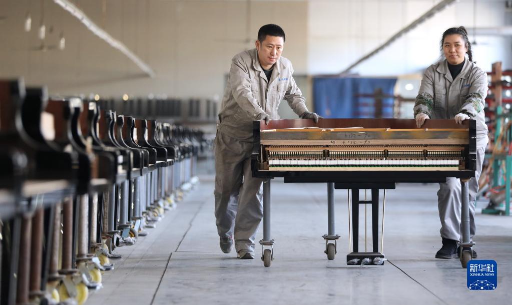 2月21日,工人在車(chē)間內推運鋼琴組件。