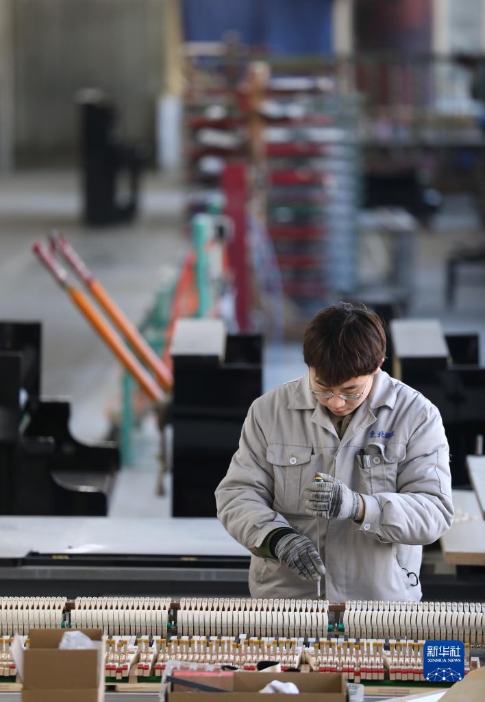 2月22日,工人在車(chē)間內組裝調校鋼琴組件。