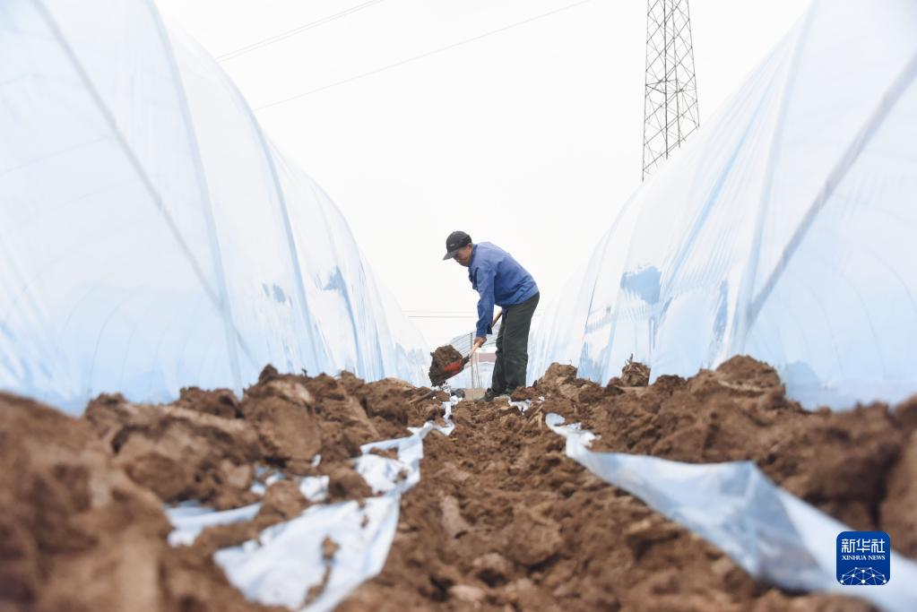2月21日,湖南省常德市澧縣澧浦街道十回港村村民在果蔬基地覆土壓膜。