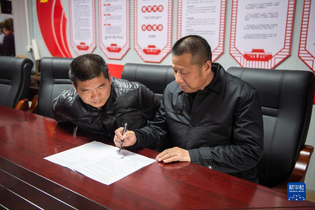 2月9日,在益陽(yáng)明天農業(yè)科技有限公司,負責人姚清明(右)向益陽(yáng)市資陽(yáng)區新橋河鎮廖河村村民李志強講解“十代服務(wù)”合同書(shū)。新華社記者 周勉 攝
