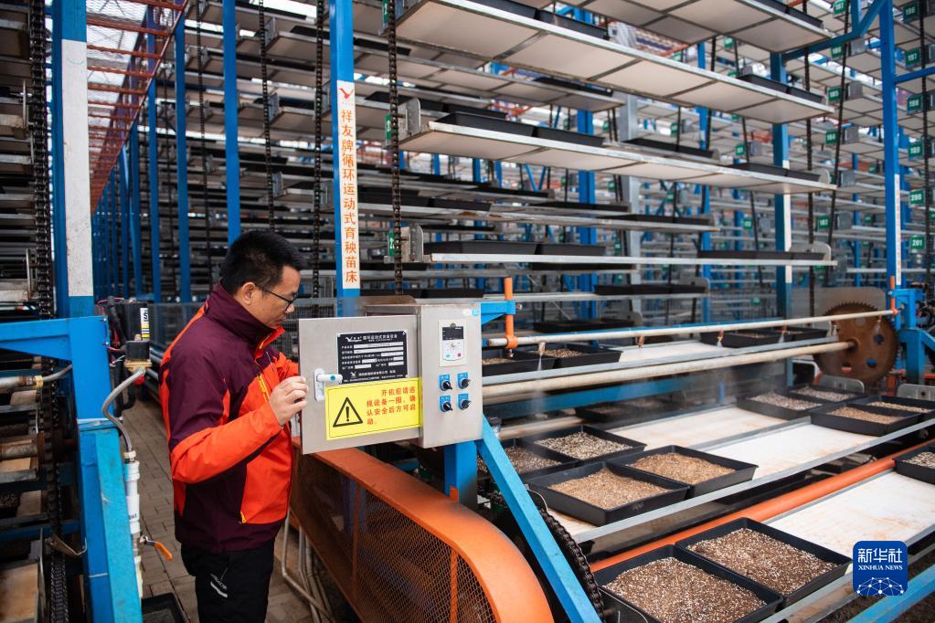 2月9日,湖南江南生態(tài)農業(yè)科技開(kāi)發(fā)有限公司負責人薛永強在位于益陽(yáng)市赫山區蘭溪鎮蘇家湖村的育秧工廠(chǎng)調試苗床。新華社記者 陳思汗 攝
