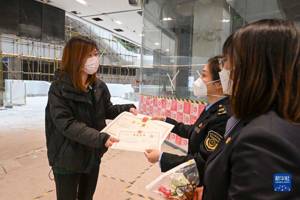 2月22日,在天津市河西區中海環(huán)宇城購物中心內,天津市河西區市場(chǎng)監管局政務(wù)服務(wù)科工作人員將制辦好的營(yíng)業(yè)執照和公章交給服務(wù)業(yè)商戶(hù)。