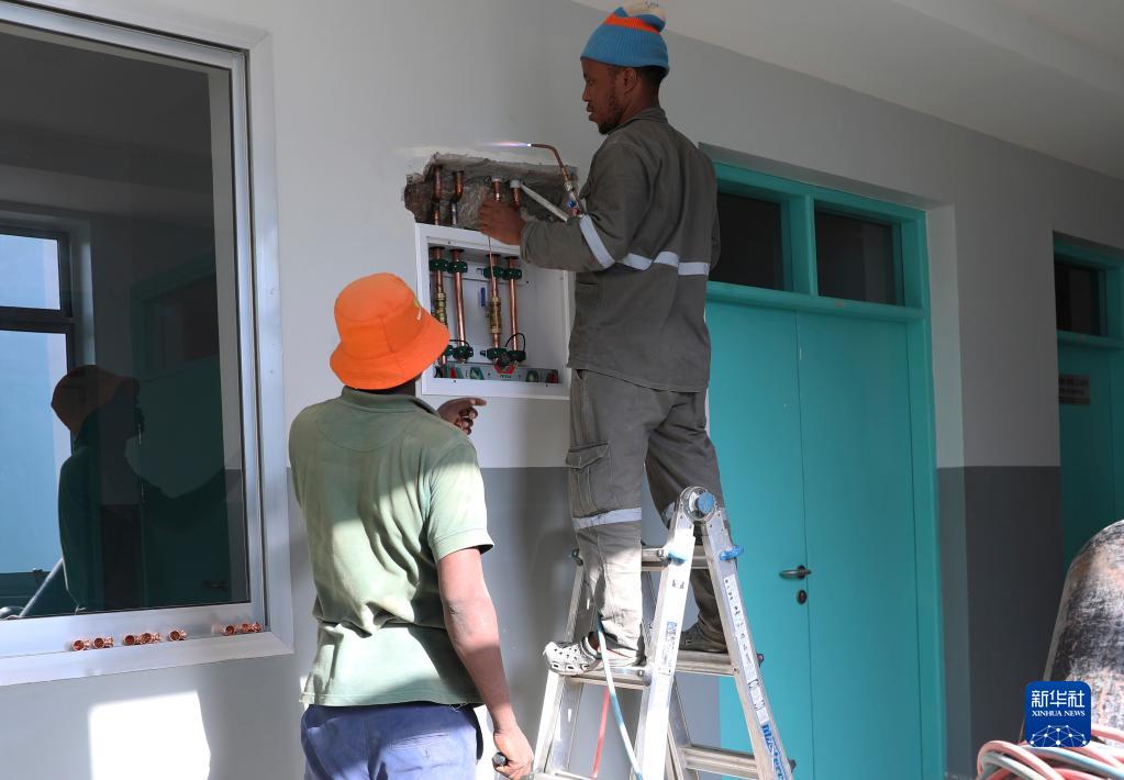 2月21日,工人在坦桑尼亞桑給巴爾島姆布茲尼地區醫院安裝醫用氧氣相關(guān)設施。
