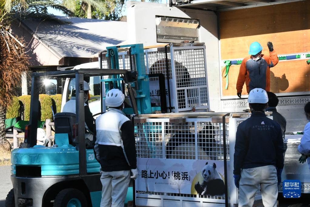 2月22日,在日本和歌山縣白浜町的“冒險世界”樂(lè )園,工作人員運送裝有大熊貓的箱子。