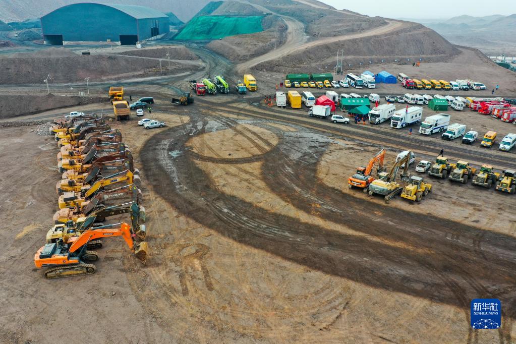 2月23日,救援車(chē)輛在內蒙古自治區阿拉善盟阿拉善左旗新井煤業(yè)有限公司露天煤礦坍塌事故現場(chǎng)附近待命(無(wú)人機照片)。