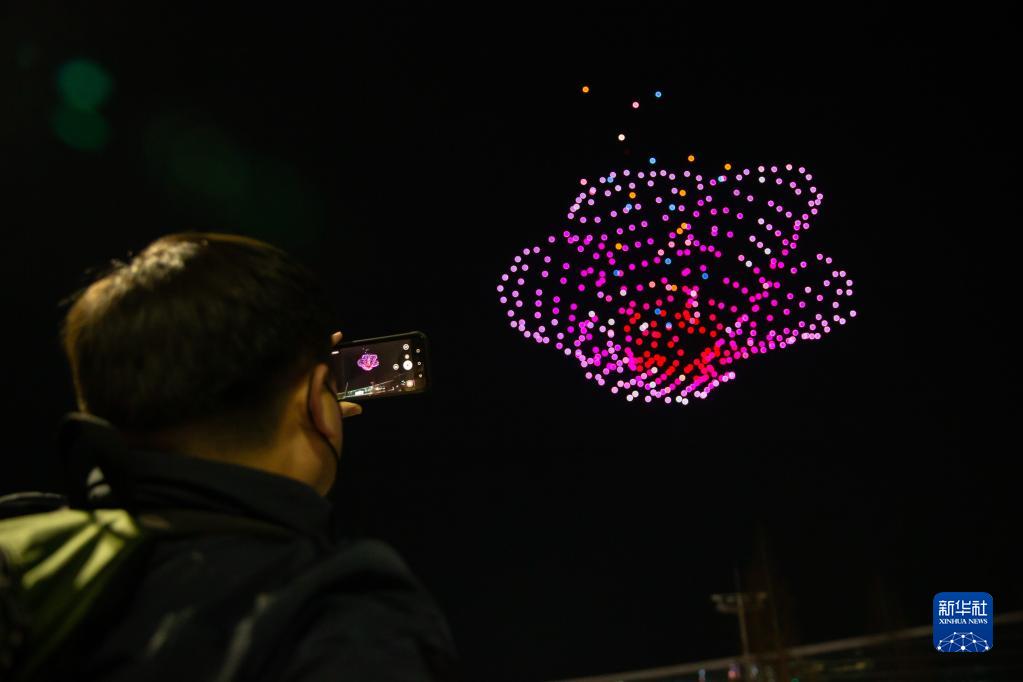 2月23日,參觀(guān)者在韓國釜山用手機拍攝2023韓國無(wú)人機展上的無(wú)人機燈光表演。
