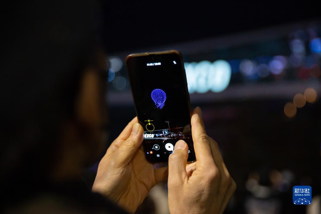 2月23日,參觀(guān)者在韓國釜山用手機拍攝2023韓國無(wú)人機展上的無(wú)人機燈光表演。