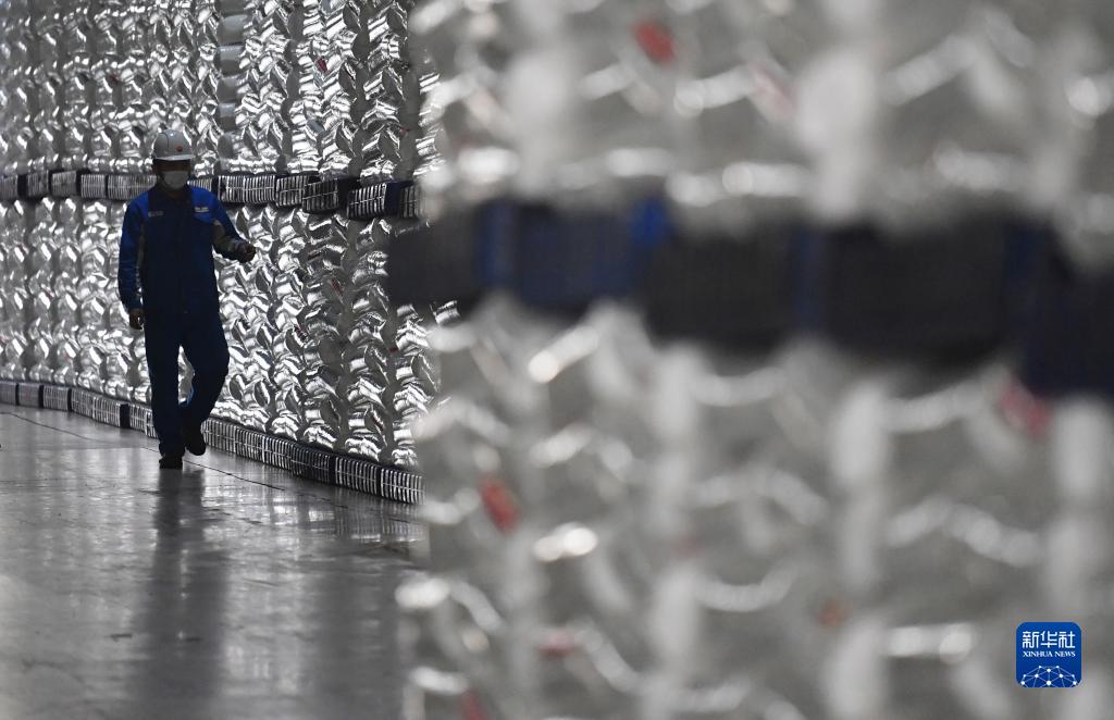 蘭州石化公司聚烯烴運行二部工作人員楊紹光在庫房?jì)炔榭串a(chǎn)品(2月21日攝)。