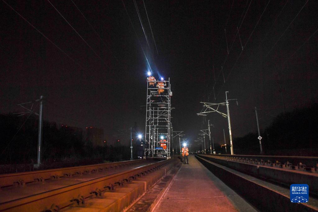 2月23日,綜合維修工在滬寧城際高鐵南京站至仙林站區間對接觸網(wǎng)進(jìn)行檢修維護。