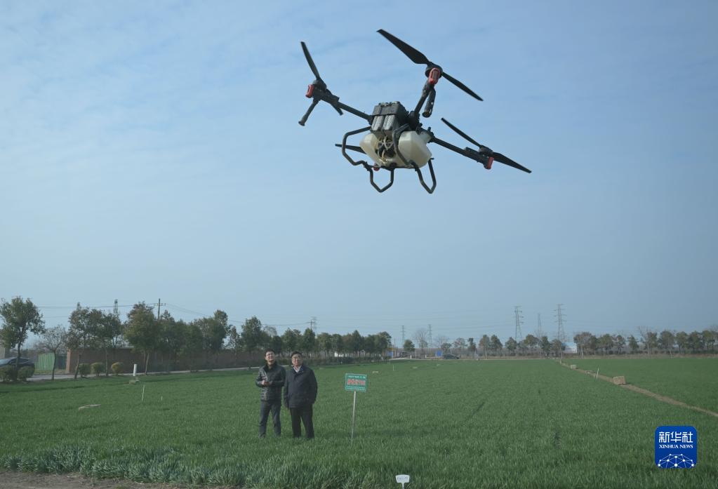 2月21日,在太和縣淙祥現代農業(yè)種植專(zhuān)業(yè)合作社,徐旭東(左)和爺爺徐淙祥用無(wú)人機對田里噴灑農藥。