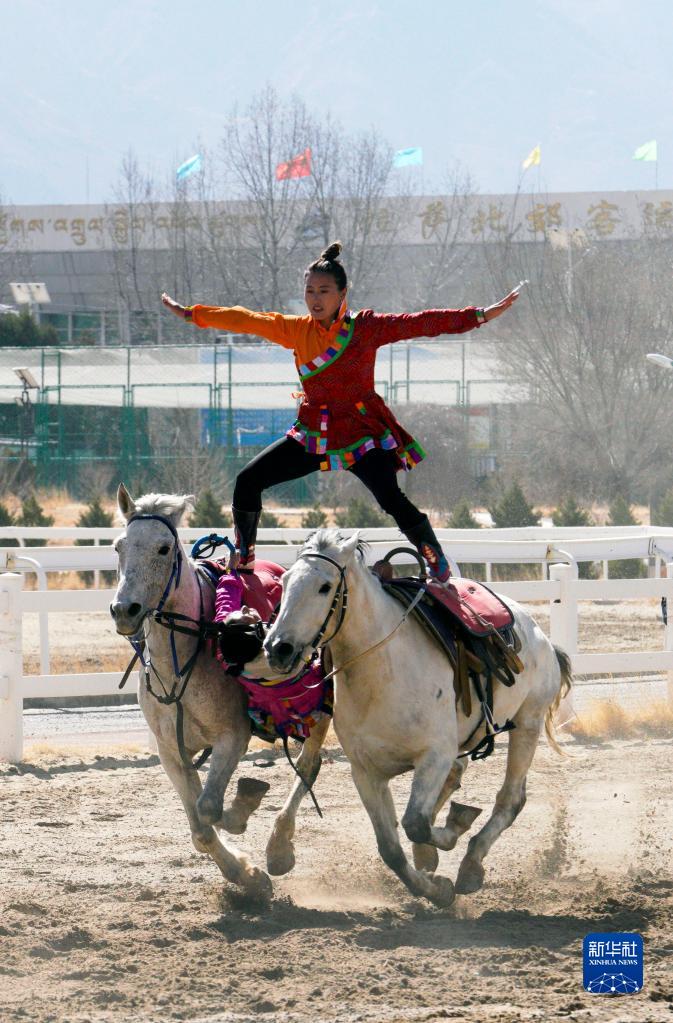 2月23日,騎手進(jìn)行單人雙馬表演。