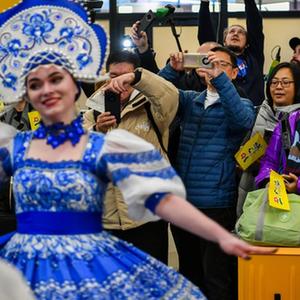 2月23日,在俄羅斯莫斯科的謝列梅捷沃機場(chǎng),中國游客觀(guān)看歌舞節目。