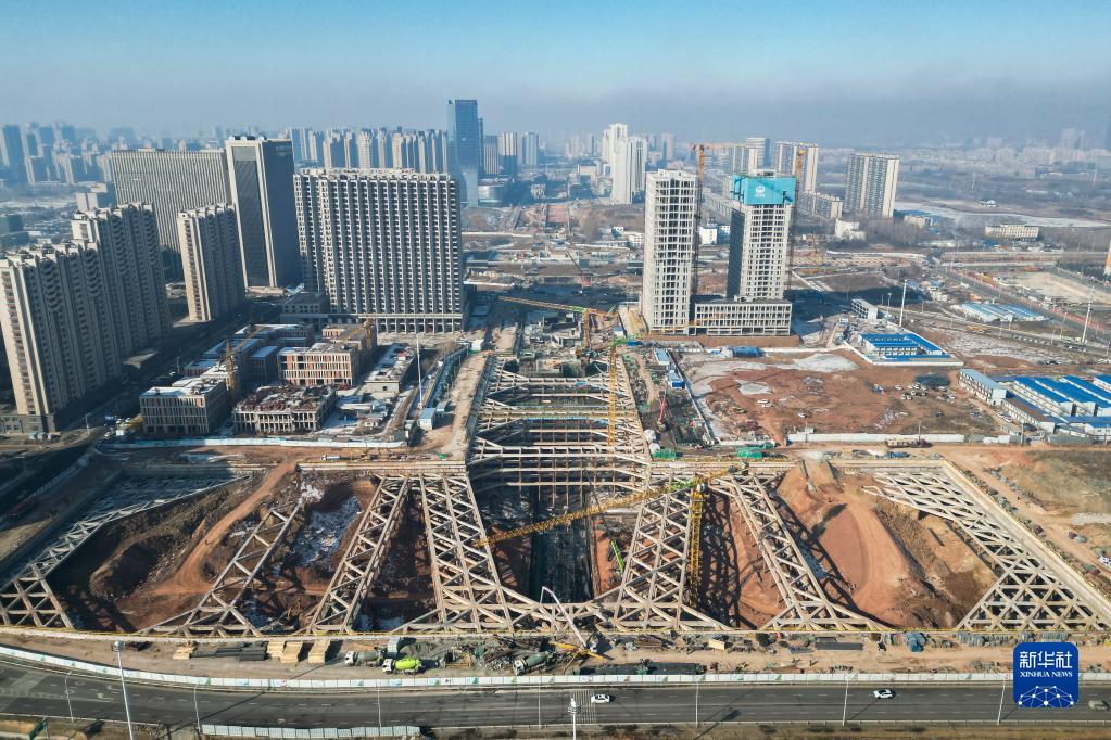 2月23日拍攝的長(cháng)春市城市軌道交通6號線(xiàn)03標段三工區華慶路站施工現場(chǎng)(無(wú)人機照片)。