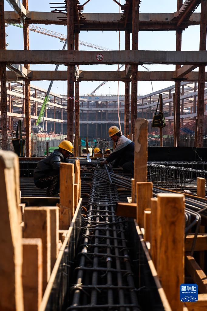 工人在長(cháng)春市城市軌道交通6號線(xiàn)03標段三工區華慶路站施工現場(chǎng)作業(yè)(2月23日攝)。