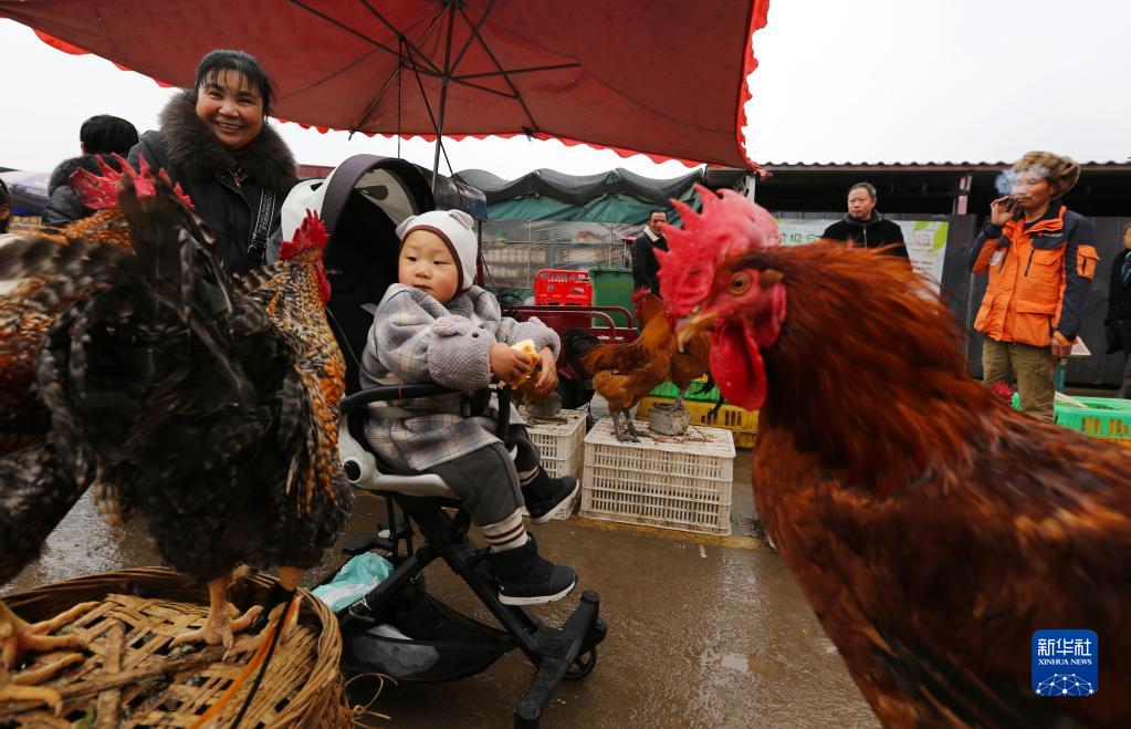 2月22日,在四川天府新區太平鎮農貿市場(chǎng),一名小朋友被大公雞吸引。