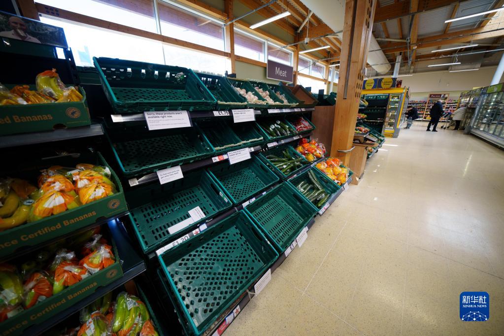 2月23日,在英國曼徹斯特,一家超市的水果和蔬菜貨架出現缺貨。