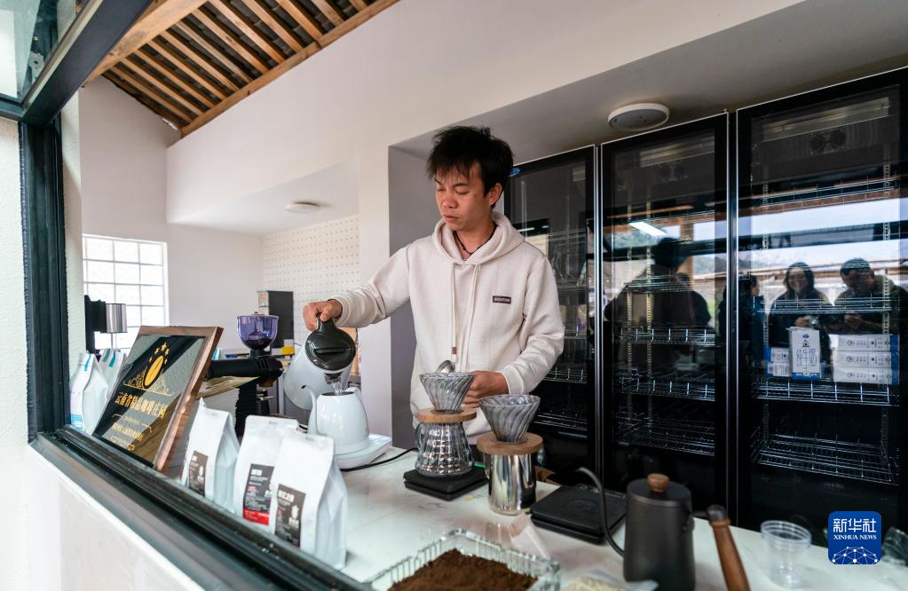一名咖啡店店主在怒江傈僳族自治州瀘水市魯掌鎮古炭河村為游客沖咖啡(2月21日攝)。