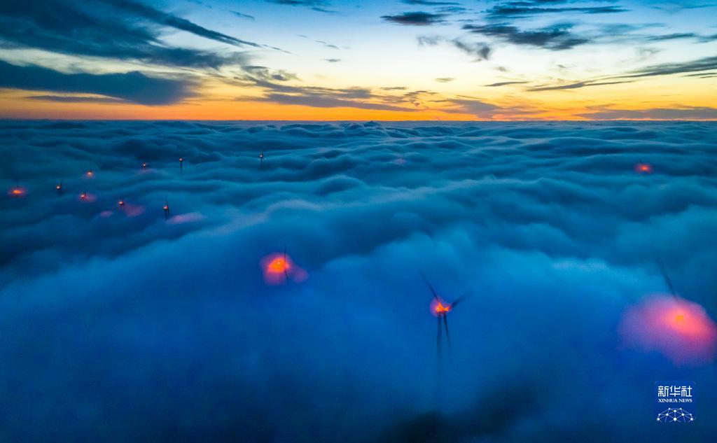 一場(chǎng)春雪過(guò)后,湖北省宜昌市秭歸縣云臺荒風(fēng)力發(fā)電場(chǎng)銀裝素裹,風(fēng)電機組在云海中旋轉,美景如畫(huà)。