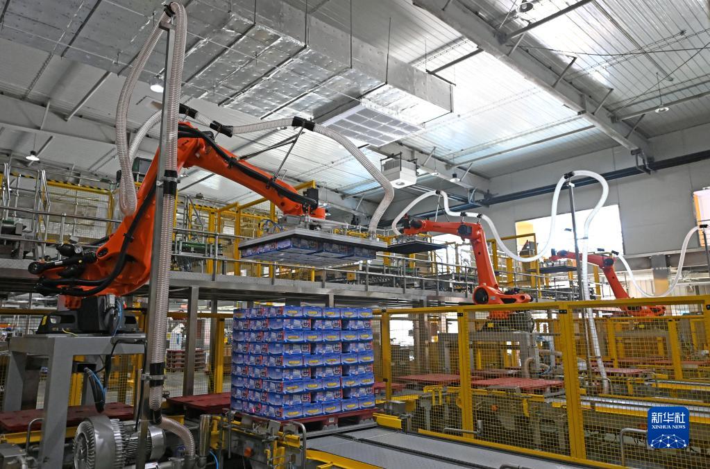 在天津海河乳品有限公司智能化生產(chǎn)線(xiàn),智能生產(chǎn)設備在轉運貨物(2月20日攝)。