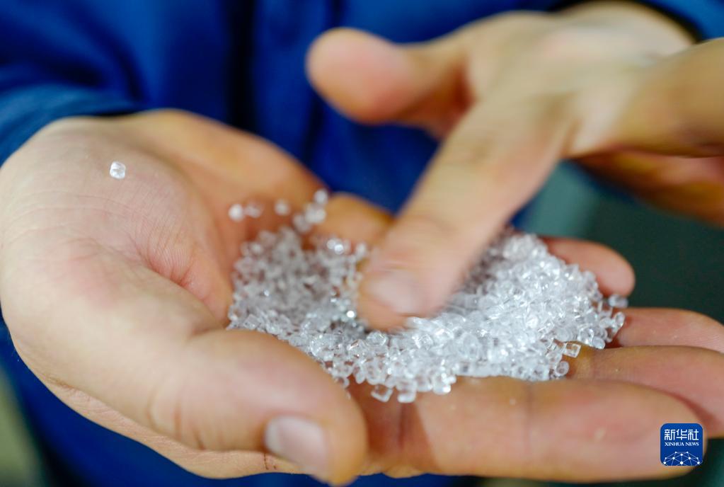 2月21日,在重慶萬(wàn)凱新材料科技有限公司生產(chǎn)車(chē)間,技術(shù)工人對生產(chǎn)出的食品級PET高分子新材料進(jìn)行檢查。