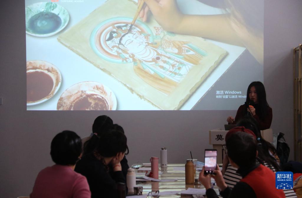 2月23日,在敦煌研究院莫高學(xué)堂,研學(xué)導師給學(xué)員講授敦煌壁畫(huà)臨摹技法。