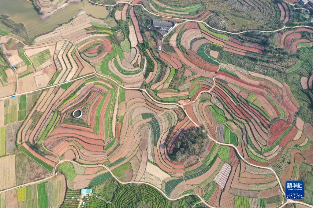 2月25日拍攝的蒲廟鎮田園春色(無(wú)人機照片)。
