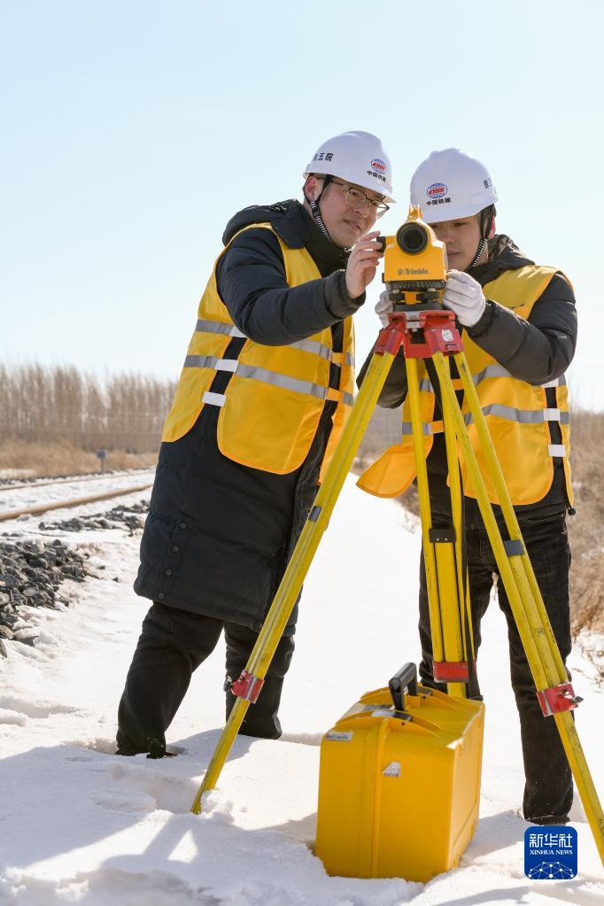 2月25日,黃騰(左)與同事在佳撫鐵路佳富段進(jìn)行勘察測量作業(yè)。