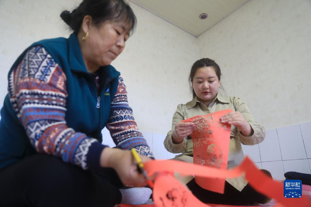 2月20日,在遼寧省朝陽(yáng)市朝陽(yáng)縣木頭城子鎮十家子村,王穎(右)在一戶(hù)村民家中和村民一起剪紙。