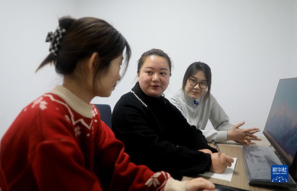 2月21日,在遼寧省朝陽(yáng)市“村姑進(jìn)城”實(shí)體店,王穎(中)向大學(xué)生征求回村工作的建議。