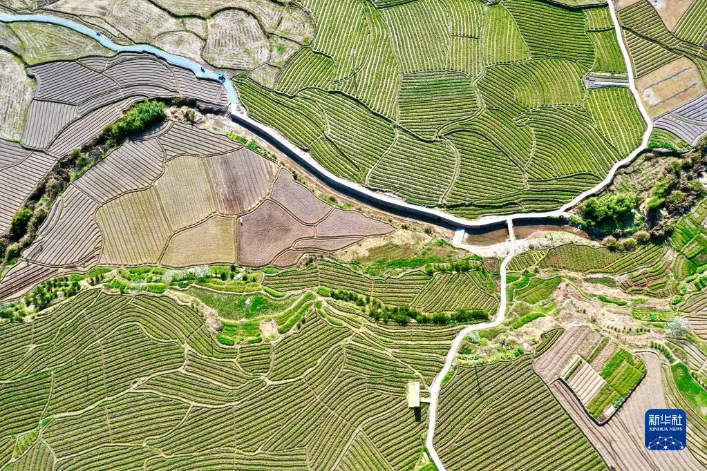 春耕時(shí)節,在福建省福州市鄉村山嶺間,一塊塊形狀各異、五彩斑斕的田地猶如大地上的拼圖,呈現別樣的春耕畫(huà)卷。