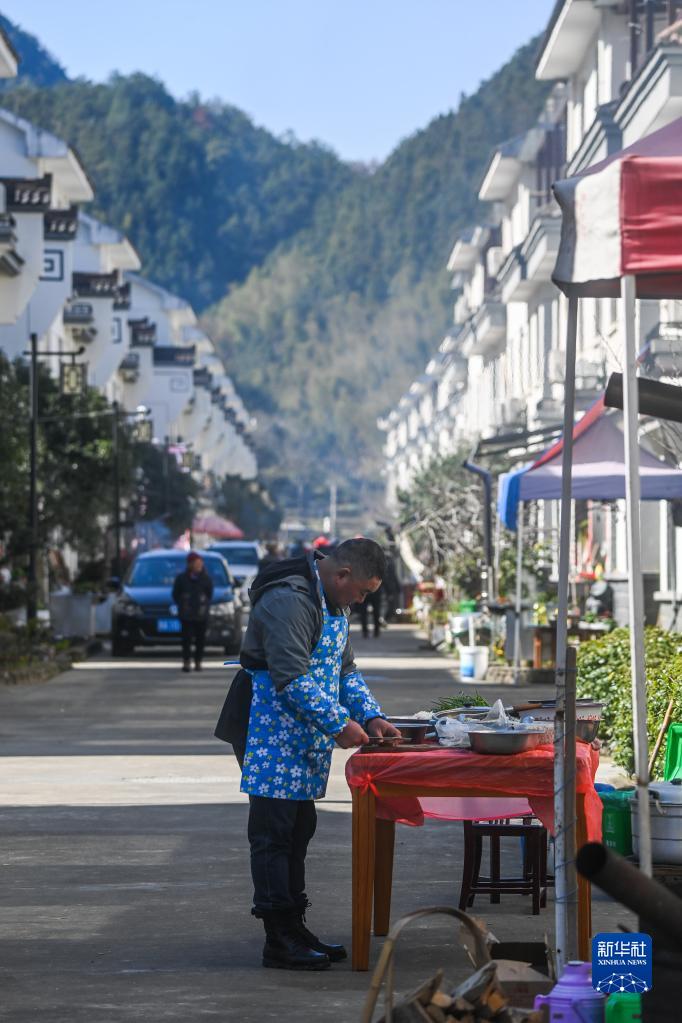 2月26日,蓮花鎮戴家新村的村民在新居門(mén)前烹飪農家菜,為百家宴做準備。