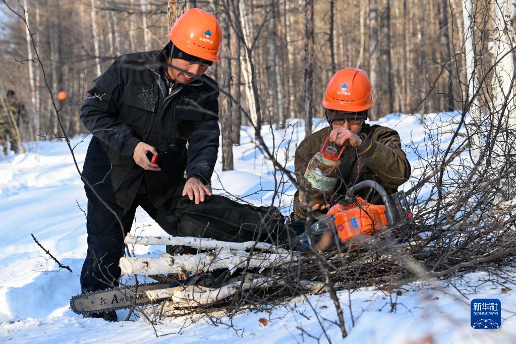 2月23日,烏龍岱林場(chǎng)402工隊的職工給油鋸加油準備作業(yè)。