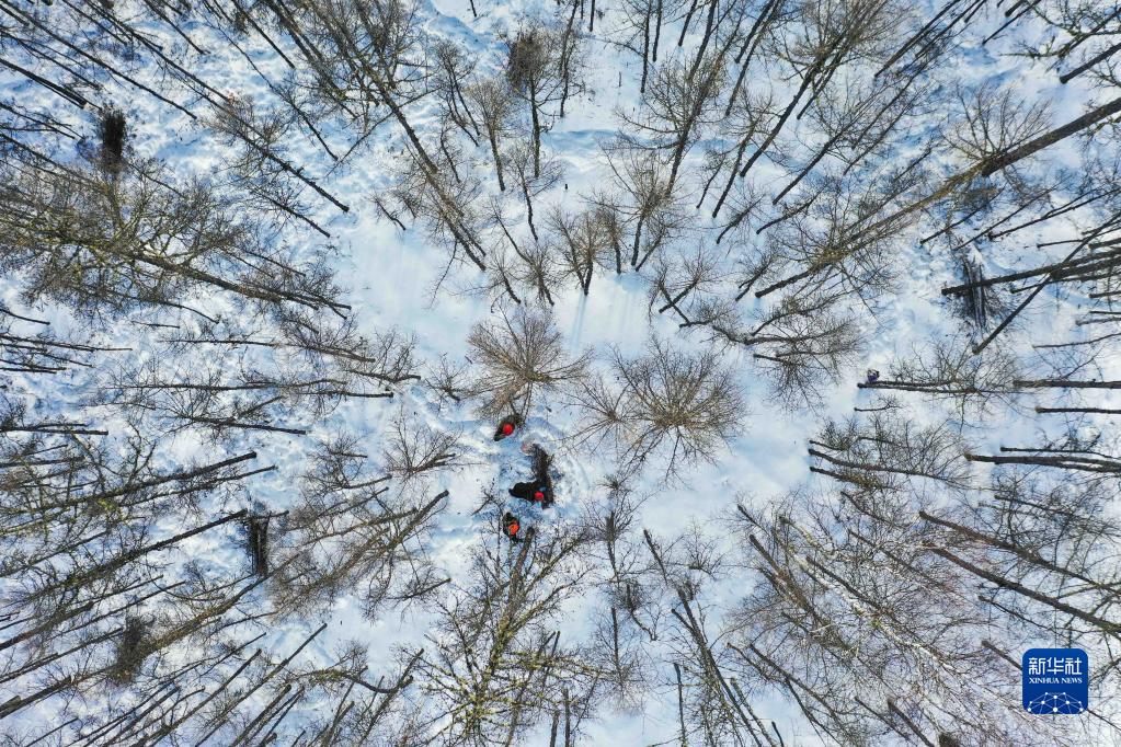 2月22日,烏龍岱林場(chǎng)職工在林區進(jìn)行綜合撫育工作(無(wú)人機照片)。