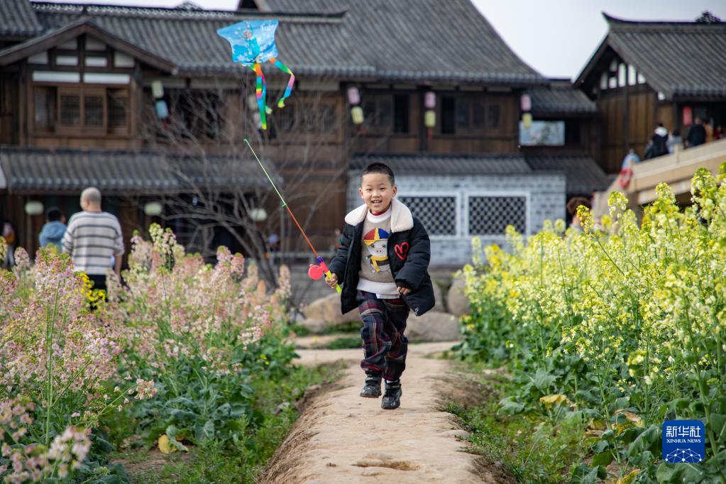2月25日,在四川省宜賓市翠屏區李莊古鎮月亮田景區,一名小朋友在盛開(kāi)的菜花田邊放風(fēng)箏。