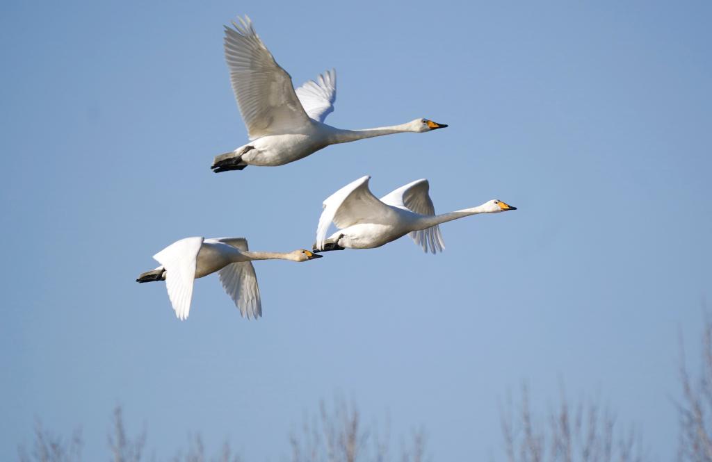2月25日,天鵝在曹妃甸濕地上空飛翔。