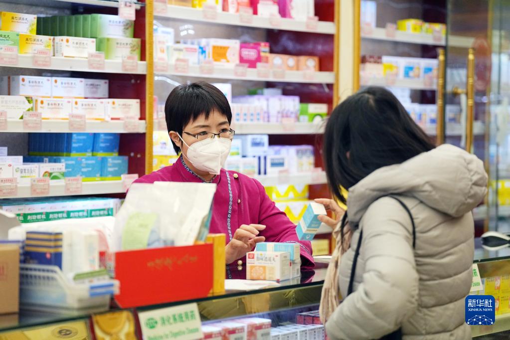 在白塔寺藥店內,張海鷗(左)為一位咨詢(xún)購藥的顧客講解幾種藥物的使用注意事項(2月22日攝)。