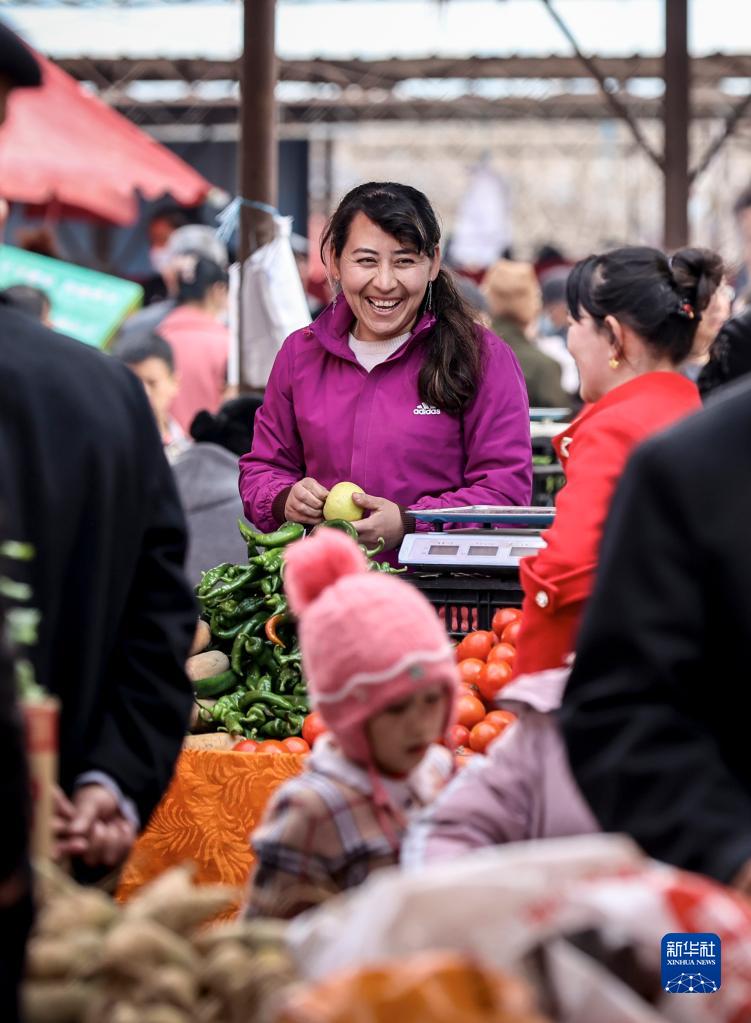 2月26日,在托克扎克鎮農貿市場(chǎng),蔬菜商販和顧客交流。