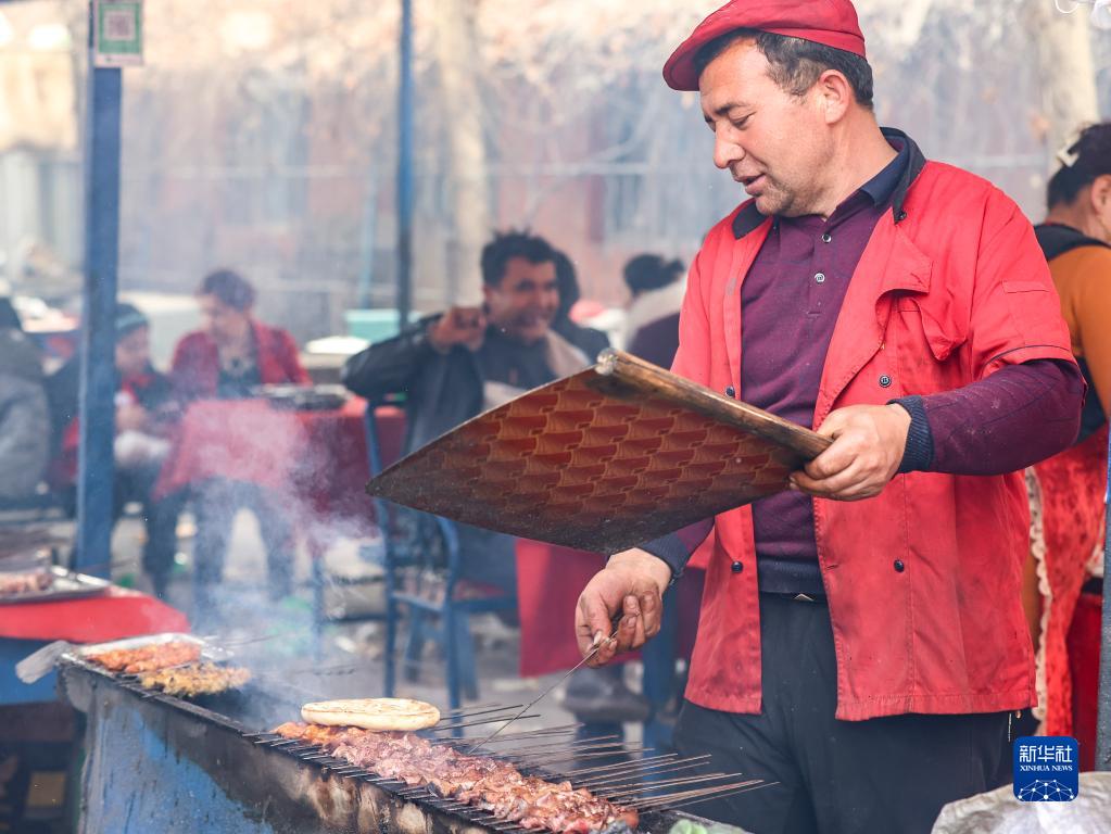 2月26日,在托克扎克鎮農貿市場(chǎng)的一處燒烤攤,攤主在烤制肉串。