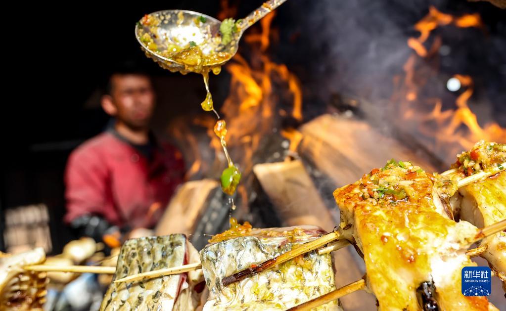 2月26日,在托克扎克鎮農貿市場(chǎng)的一處攤位前,攤主給炙烤的魚(yú)塊淋上料汁。