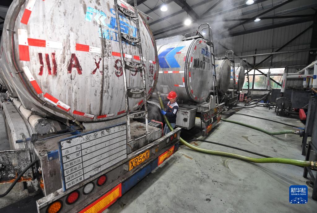 2月21日,四川一家環(huán)??萍加邢薰締T工將油罐車(chē)運來(lái)的餐廚廢油轉送至生產(chǎn)線(xiàn)。