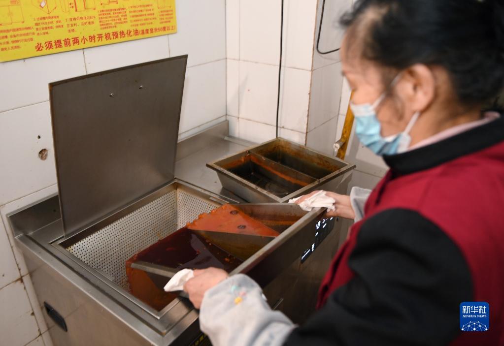 2月25日,成都一家火鍋食府員工將廢棄火鍋鍋底倒進(jìn)油水分離器收集廢油。