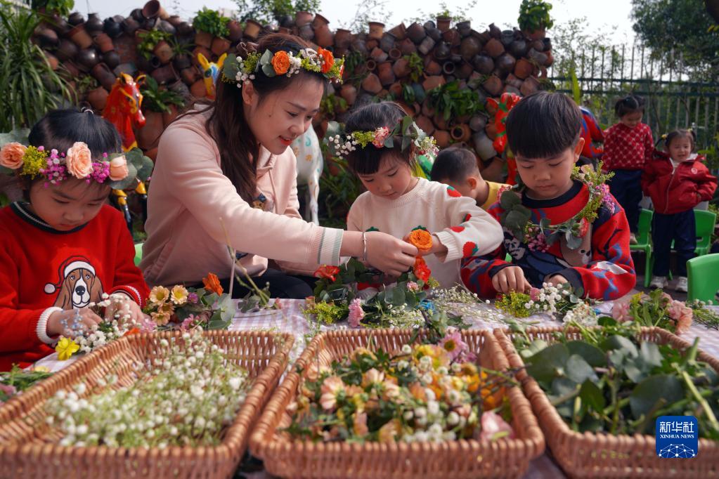 2月27日,在重慶市北碚區縉云幼兒園,孩子們在老師的指導下編制花環(huán)。