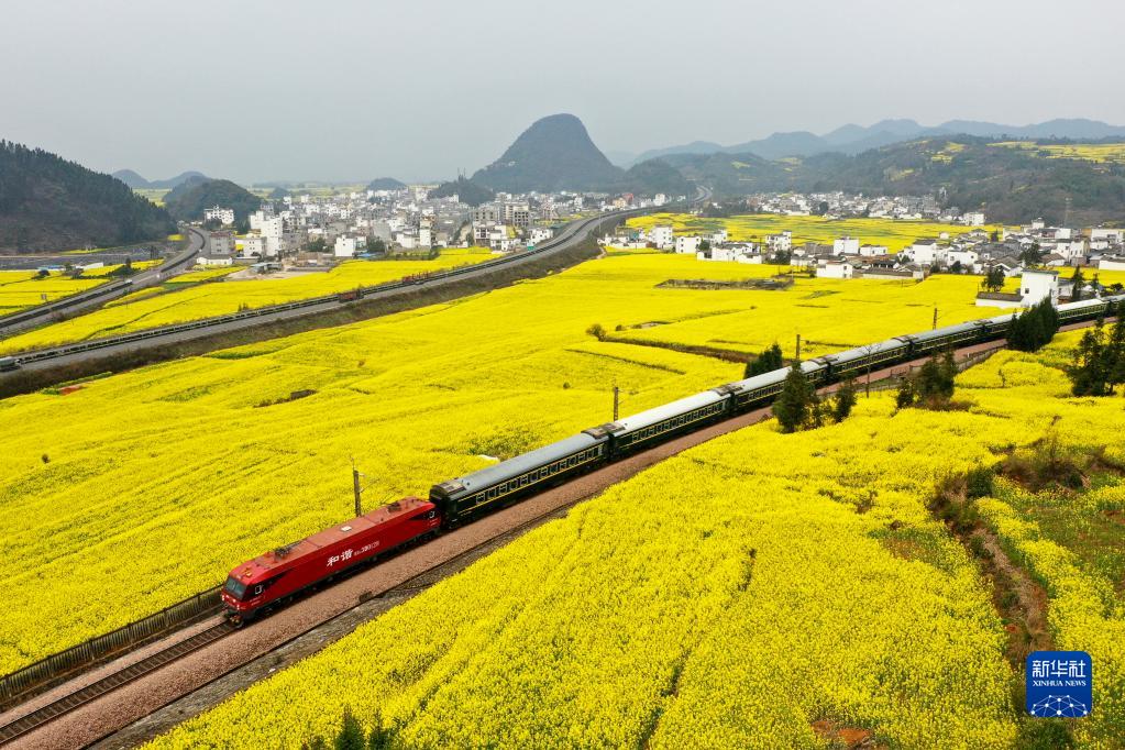 2月27日,旅游專(zhuān)列行進(jìn)在云南曲靖市羅平縣的油菜花海中(無(wú)人機照片)。