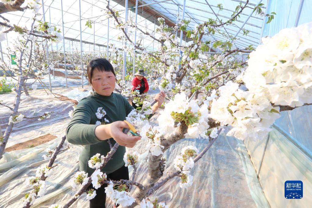 2月27日,山東省棗莊市山亭區翼云誠信家庭農場(chǎng)的果農為大棚里的櫻桃花進(jìn)行疏花。