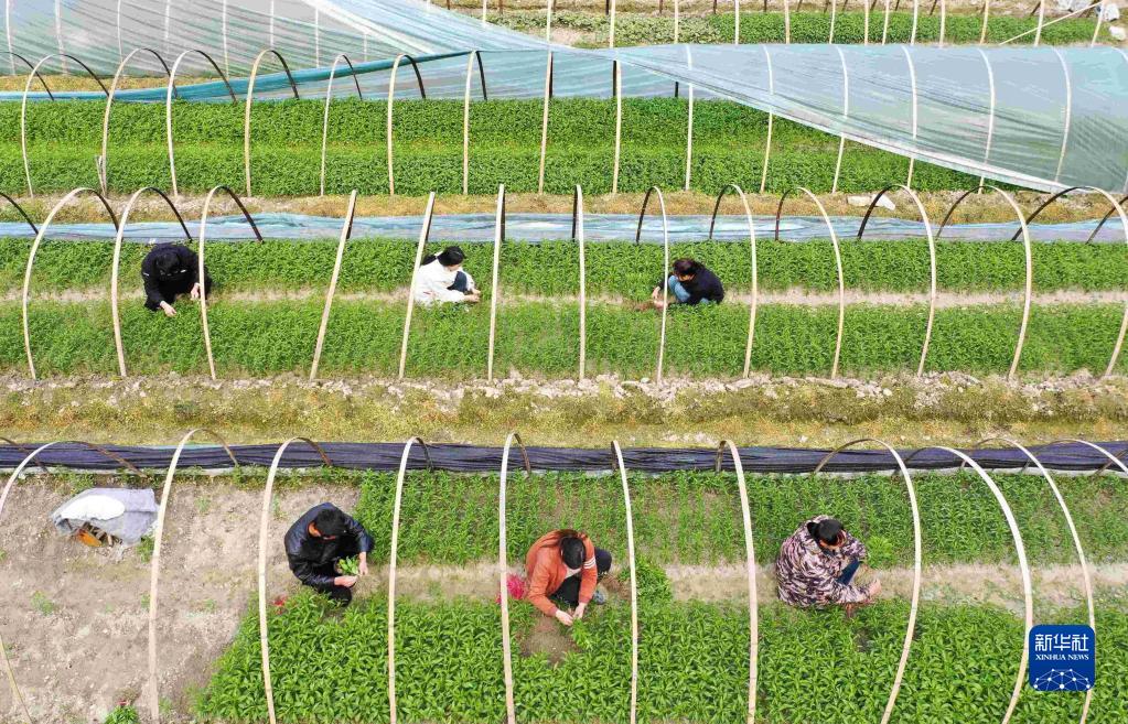 2月27日,在貴州省榕江縣平江鎮平江社區,村民在辣椒苗育苗基地拔辣椒苗(無(wú)人機照片)。