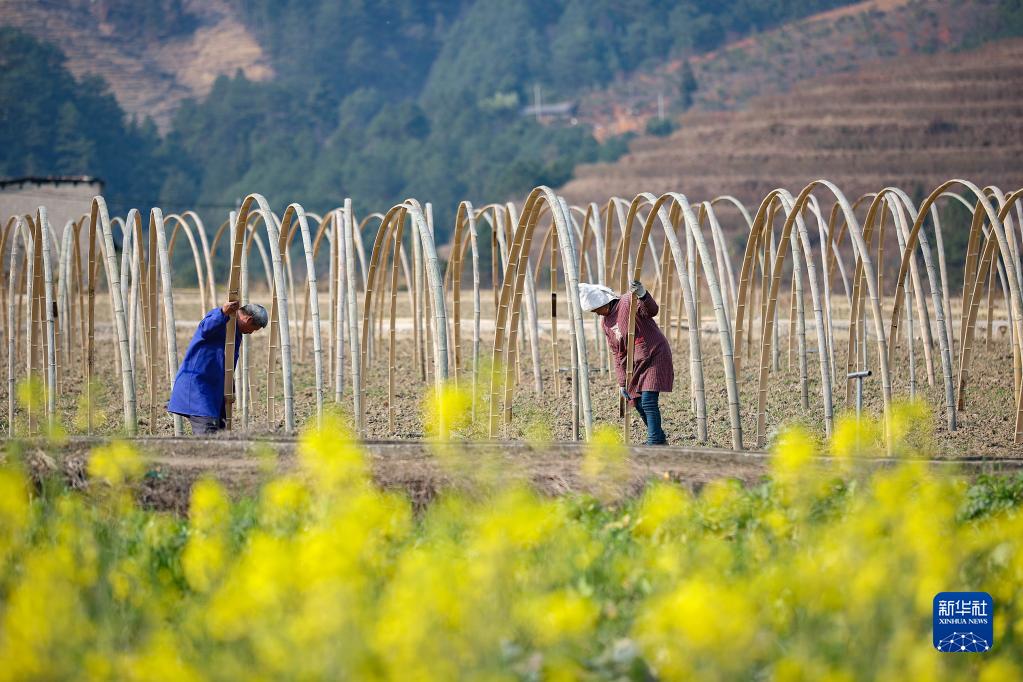 2月27日,瓜農在貴州省黔東南苗族侗族自治州丹寨縣興仁鎮城江村西瓜田間搭建瓜棚。