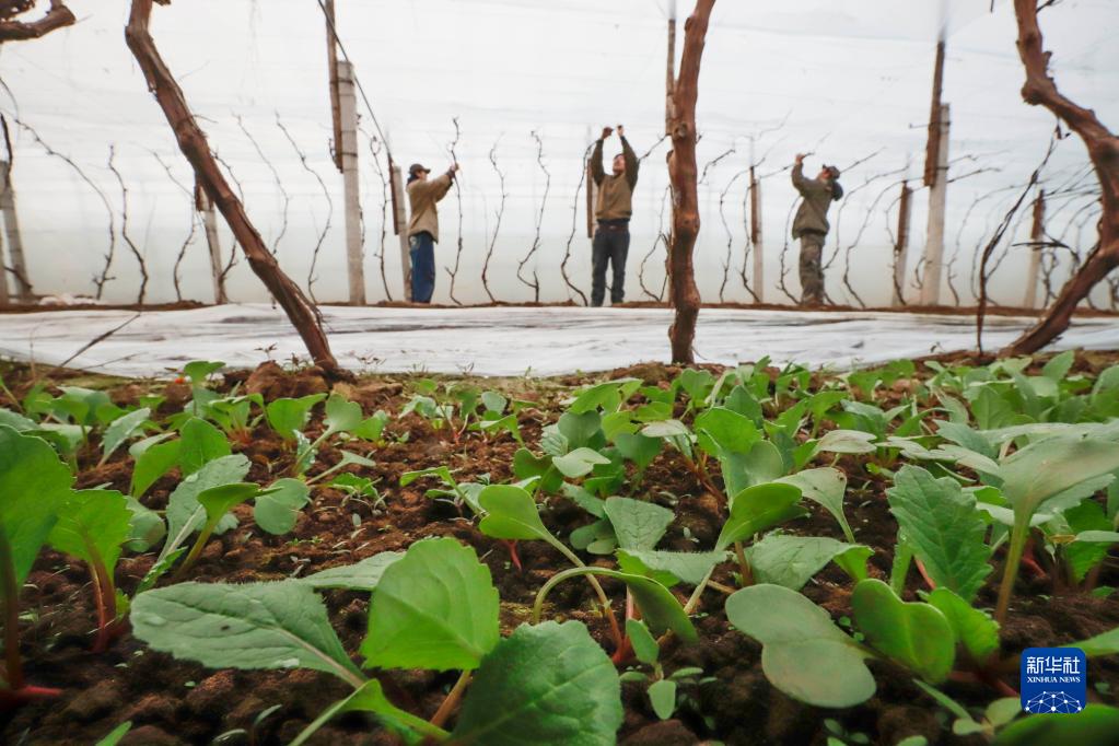 2月28日,河北省遵化市侯家寨鎮農民在大棚綁扎葡萄藤蔓。